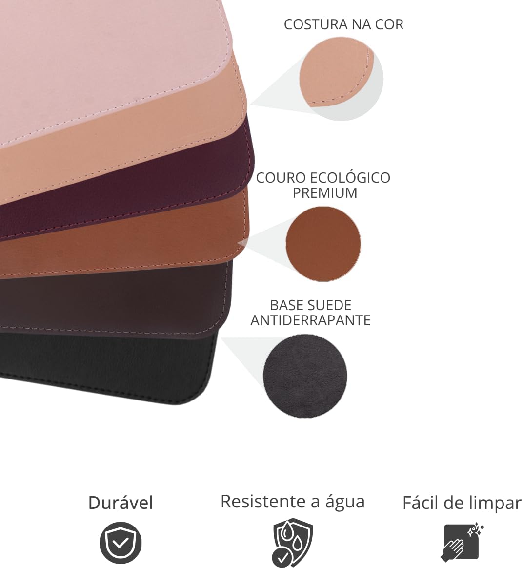Feito em couro ecológico, o material é não apenas sustentável, mas também oferece uma textura agradável ao toque. A construção do produto garante que ele seja resistente a arranhões e desgastes, garantindo um uso prolongado sem perder a beleza. As bordas são bem acabadas, evitando desfiamentos e proporcionando um acabamento premium que se destaca entre os concorrentes.