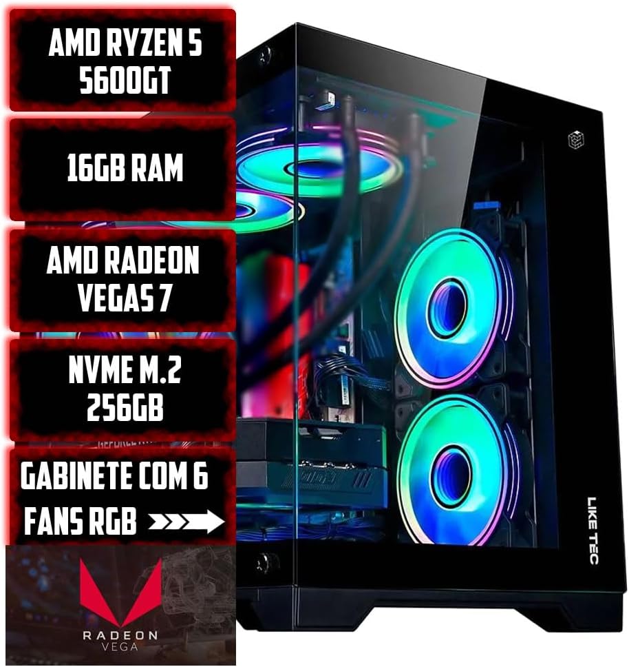 | PC Gamer Ryzen 5 5600GT | R$ 4.200,00 | 16GB RAM, NVME M.2 256GB, Gráficos AMD Radeon | Gamers casuais e profissionais |